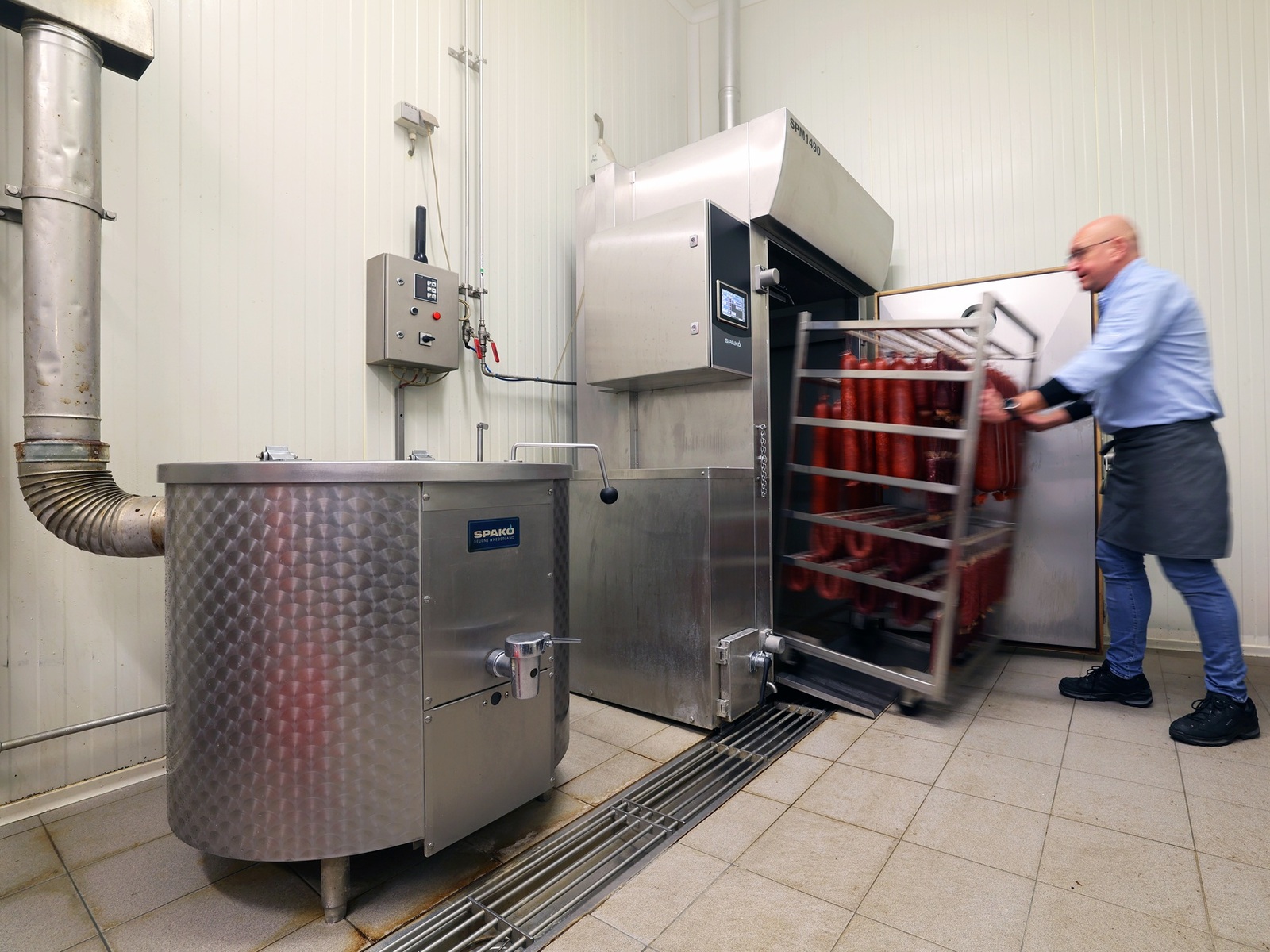 De keuze voor Spako berust niet op toeval. “Je weet zelf wat je wilt en je zoekt daar machines bij die het werk gemakkelijker maken. Je kan eigenlijk alles met Spako. Als je de deuren ondersteboven erin wil hebben, dan regelen ze dat. Zij leveren maatwerk. Spako weet hoe ze een rookkast zo moeten maken dat-ie precies past bij onze procedures, recepturen en programma’s”, zegt Laurens. “Na het roken, koken we de producten meestal nog. Door te koken, verhoog je zowel de F- als de P-waarde en daarmee de houdbaarheid (THT) van de producten. Onze gerookte kippenhammen en kipfilets blijven tot wel negen maanden goed. We vacümeren ze warm. Als je op een goede en slimme manier werkt, kun je de THT van je vlees op een veilige manier flink verlengen.”